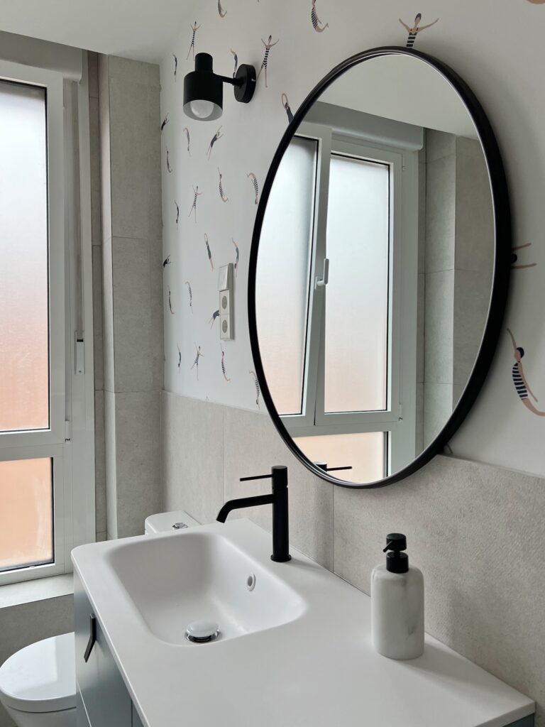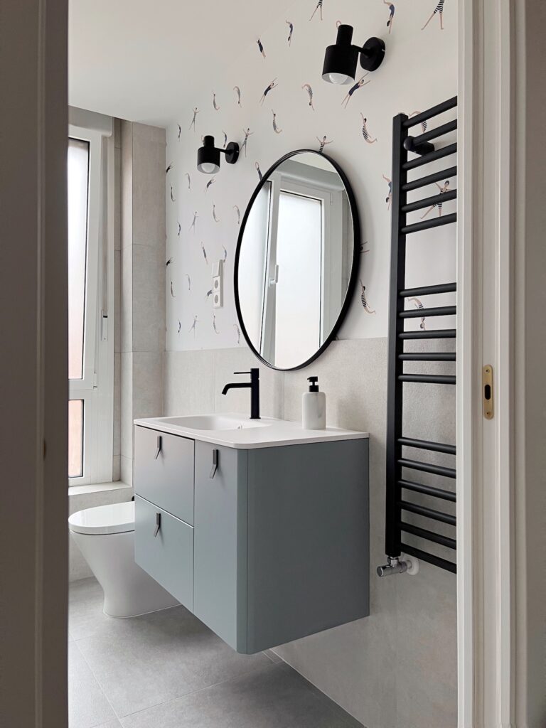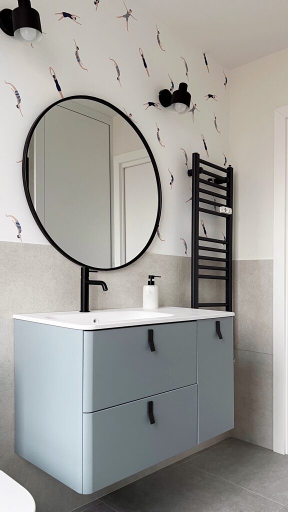 La nueva distribución incorpora un dormitorio principal con baño en suite, concebido como un refugio íntimo y luminoso. El baño de los niños se reviste con un papel pintado de nadadoras, un guiño divertido y fresco que rompe la neutralidad con una nota de personalidad.