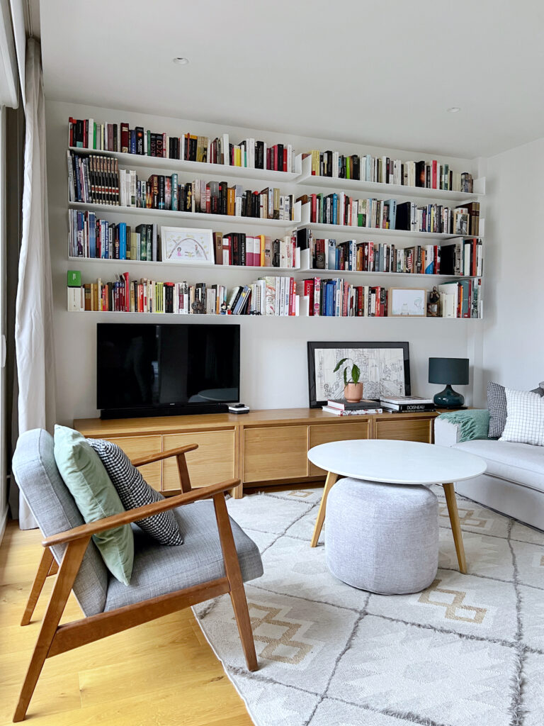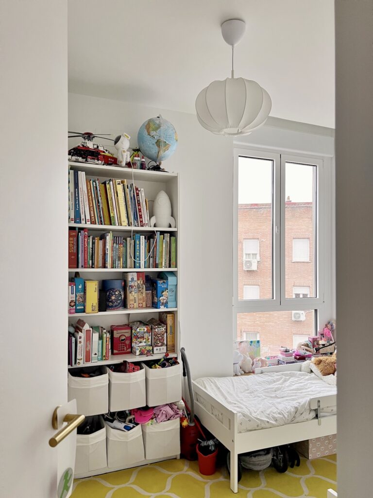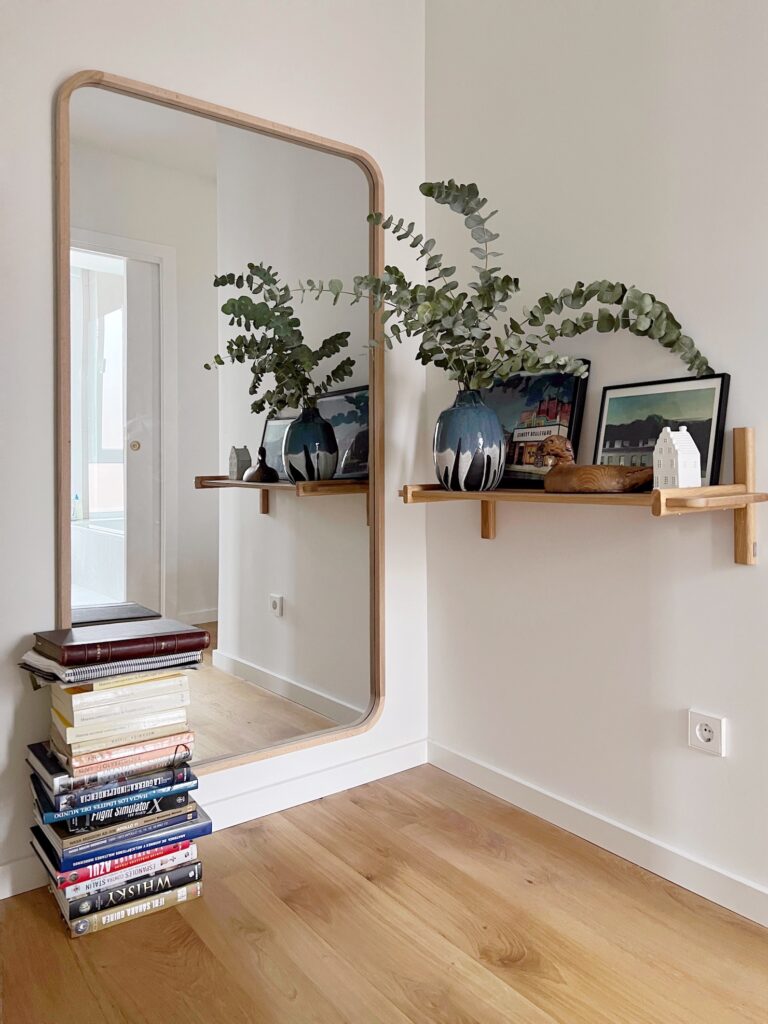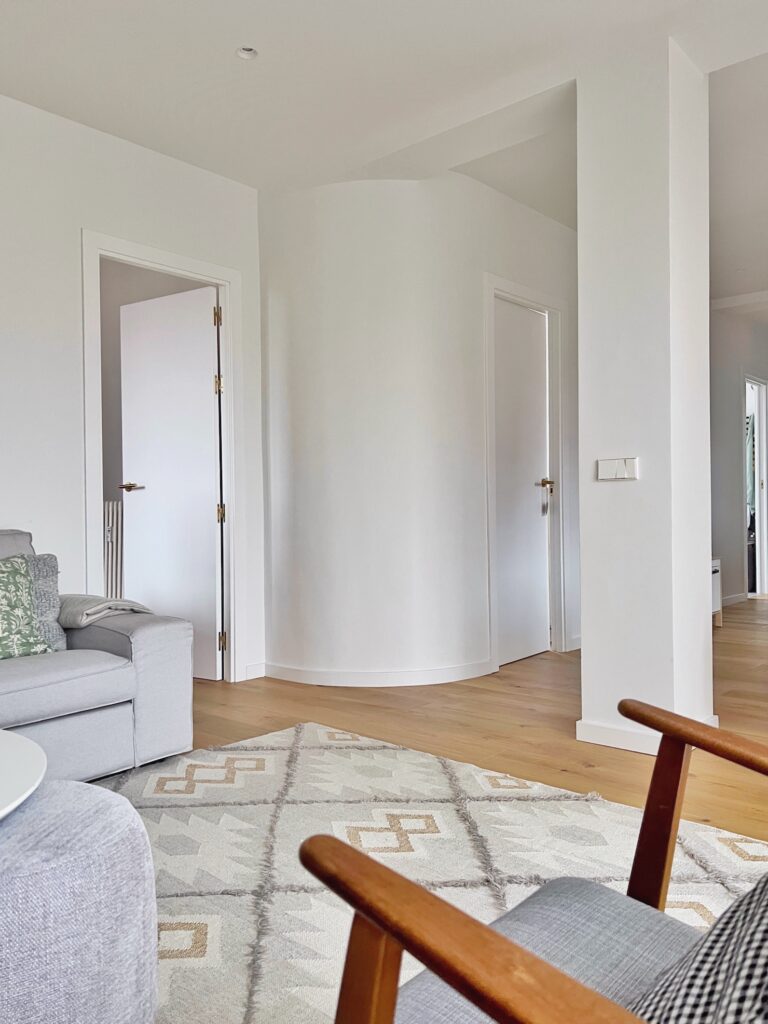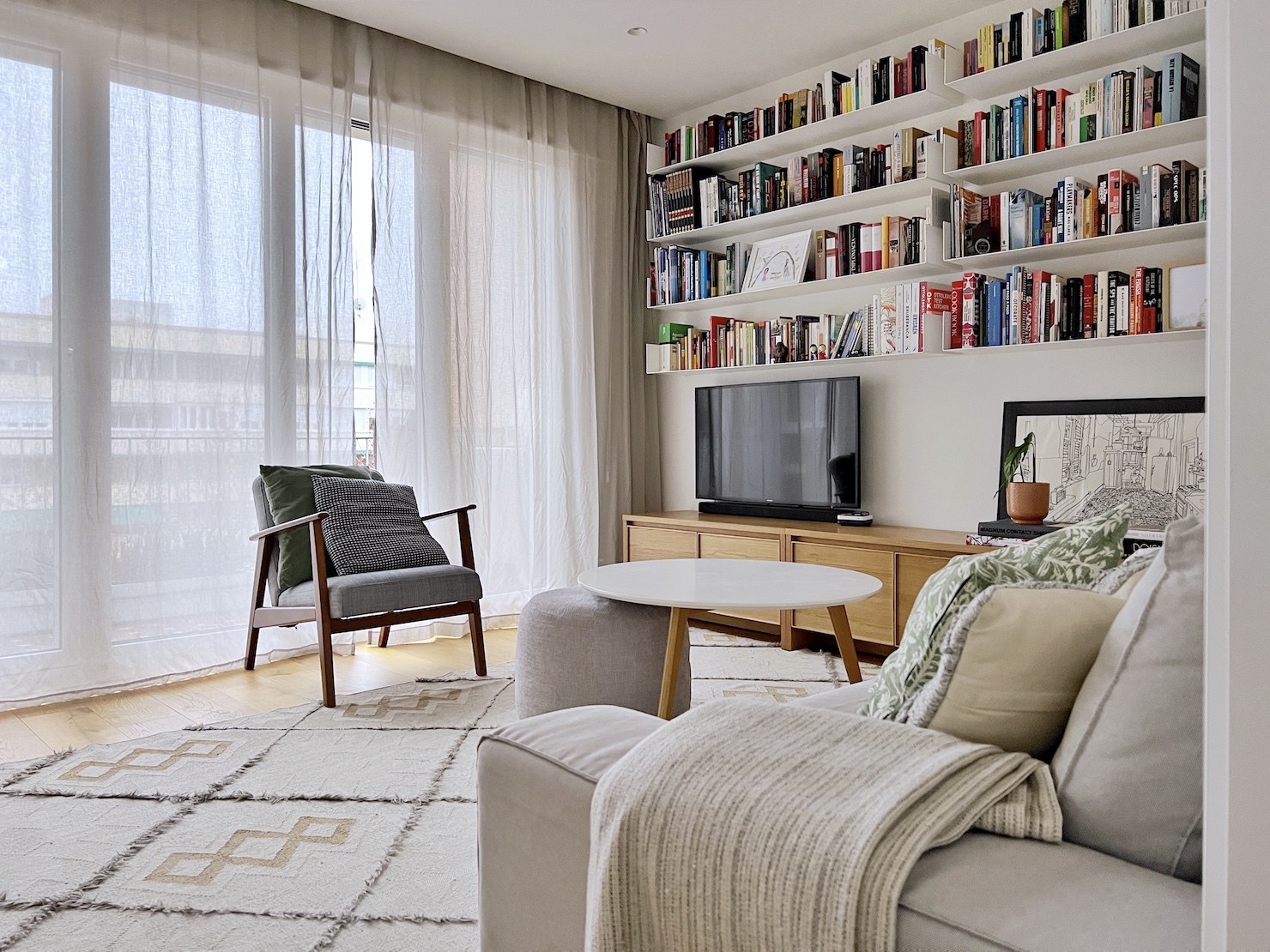 En el salón, una librería suspendida se convierte en el centro visual de la vivienda: ligera, escultórica y funcional, articula el espacio y refleja el equilibrio entre diseño y practicidad. El recibidor, por su parte, adopta un estilo marcadamente nórdico, con líneas puras y materiales naturales que anticipan el tono cálido y luminoso del resto del proyecto.