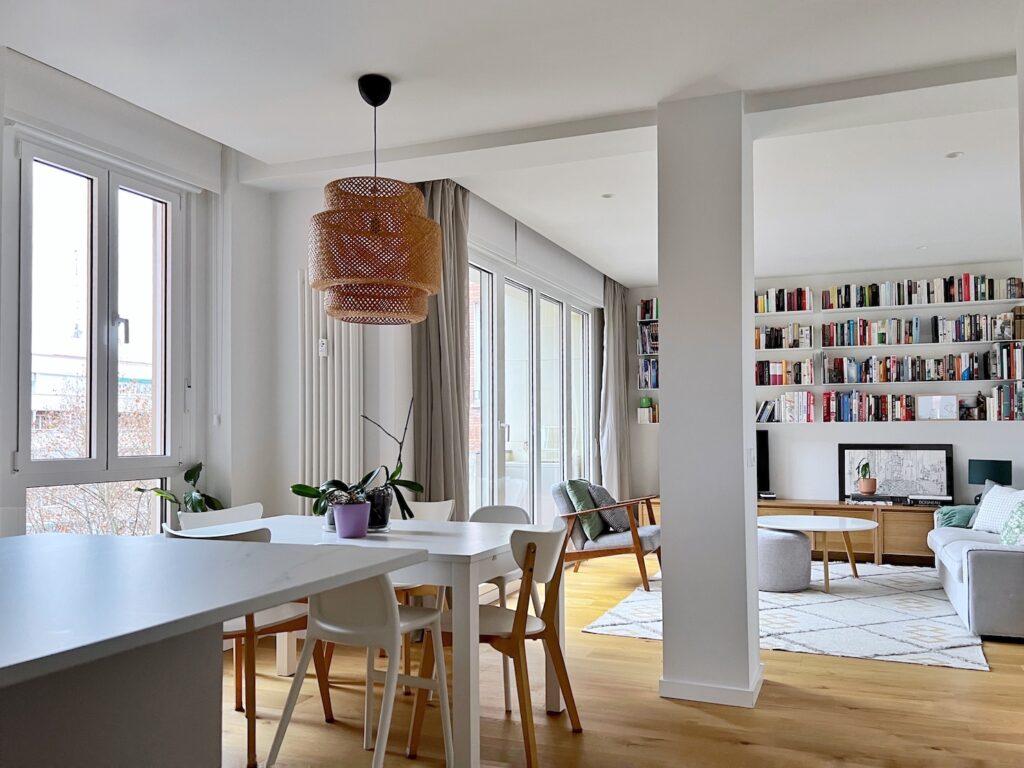El nuevo diseño reorganiza la vivienda por completo para ganar amplitud, coherencia y fluidez. Uno de los gestos más significativos fue optimizar el gran ventanal del salón, conectándolo con una terraza agradable que ahora forma parte natural de la zona de día. La luz entra sin obstáculos y el interior se abre al exterior, extendiendo la sensación de espacio.